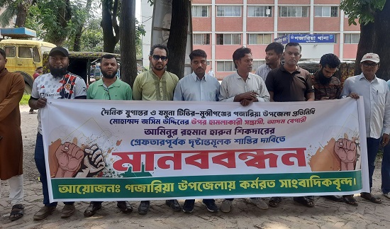দৈনিক যুগান্তর ও যমুনা টিভির গজারিয়া উপজেলা প্রতিনিধি মোহাম্মদ জসিম উদ্দিনের উপর হামলার ঘটনায় জড়িতদের গ্রেপ্তারপূর্বক শাস্তির দাবিতে মানববন্ধন করেছে উপজেলায় কর্মরত সাংবাদিকরা।