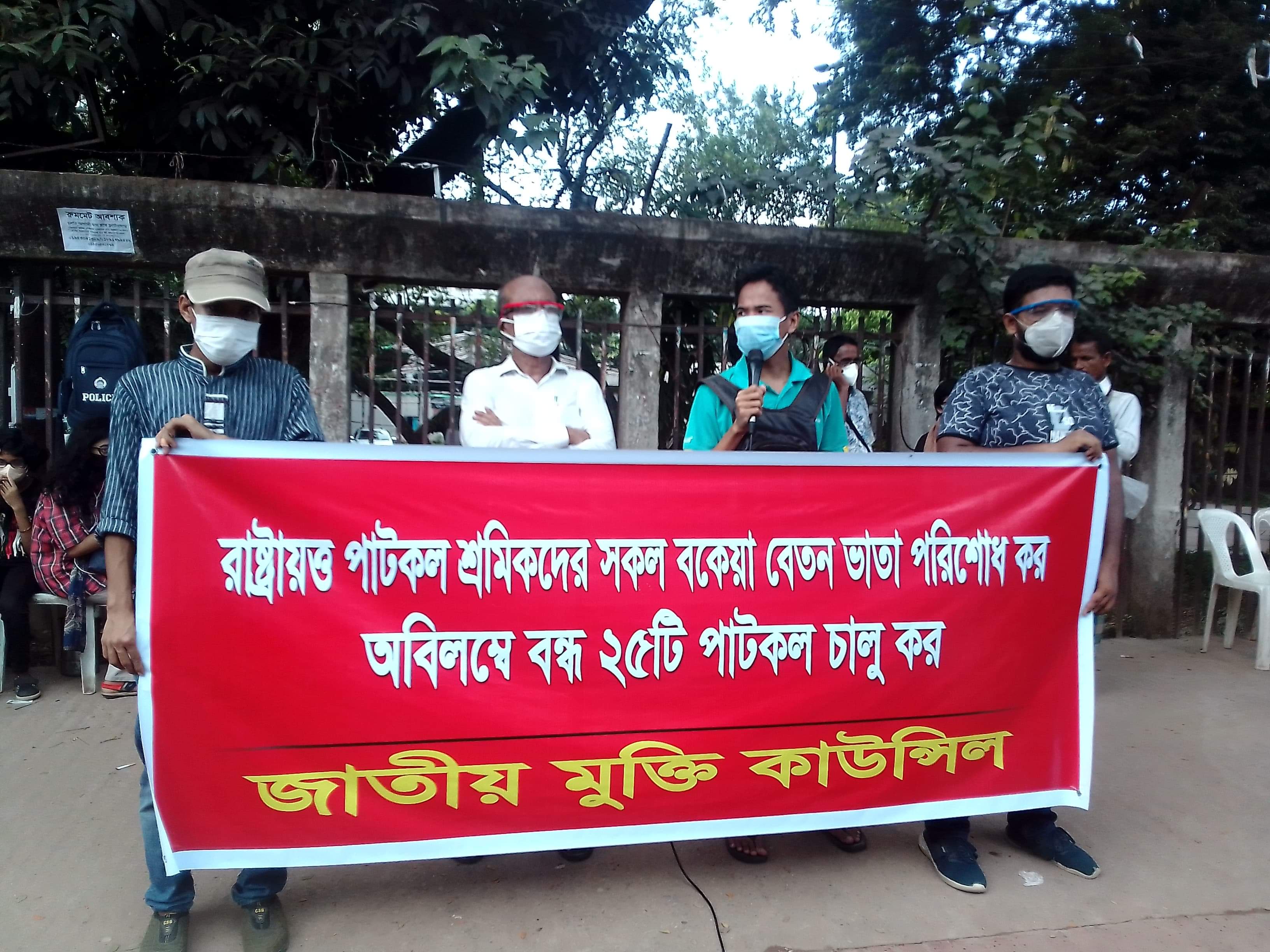 রাষ্ট্রায়াত্ত¡ ২৫টি পাটকল পুনরায় চালুর দানিয়ে জাতীয় মুক্তি কাউন্সিলের নেতারা বলেছেন, পাটকলগুলোতে দুর্নীতির কারণে রুগ্ন শিল্পে পরিণত হয়েছে। এজন্য শ্রমিকরা দায়ি নয়।