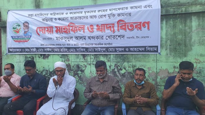 নারায়ণগঞ্জের ফতুল্লার তল্লায় মসজিদে বিস্ফোরণের ঘটনায় ও করোনা ভাইরাসে সারাদেশে মৃতদের রূহের আত্মার মাগফেরাত কামনা ও বিস্ফোরণে দগ্ধ চিকিৎসাধীন ও করোনায় আক্রান্তদের সুস্থতা কামনায় দোয়া মহফিল ও খাদ্য বিতরণ কর্মসূচী পালন করা হয়েছে। শুক্রবার বিকেলে বিকালে তল্লা বাইতুল সালাত জামে মসজিদ সংলগ্ন সর্দার পাড়ায় এ দোয়া মহফিল ও খাদ্য বিতরণ কর্মসূচী অনুষ্ঠিত হয়।