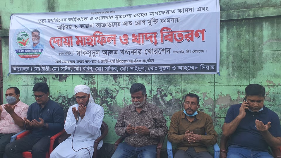 এতে খোরশেদের সভাপতিত্বে উপস্থিত ছিলেন টিম খোরশেদের মেম্বার ইসলাহউদ্দিন, আনোয়ার মাহমুদ বকুল, মনিরুল ইসলাম সজল, রানা মুজিব, জামাল হোসেন, হোসেন সর্দার প্রমুখ। এসময় খোরশেদ বলেন, প্রতিটি জীবন যে কতটা মূল্যবান এটা যার প্রিয়জন হারায় সে বুঝে। আমরা সকলের সুস্থতার জন্য দোয়া করি এবং যারা মারা গেছেন তাদের রূহের আত্মার মাগফেরাত কামনা করছি।