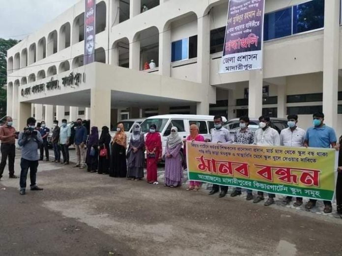 মার্চ মাস থেকে স্কুল বন্ধ থাকাকালীন কিন্ডারগার্টেন স্কুলের বাড়ি ভাড়া মওকুফ, শিক্ষকদের প্রনোদনা প্রদান ও সামাজিক দূরত্ব বজায় রেখে স্কুল খুলে দেওয়ার দাবিতে বুধবার সকালে মাদারীপুর জেলা প্রশাসকের কার্যালয়ের সামনে মানববন্ধন অনুষ্ঠিত হয়।